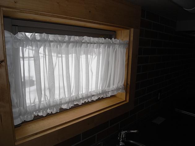 キッチンの小窓はボイル生地を2.5倍ヒダでギャザー仕上げにしたカフェカーテンを。